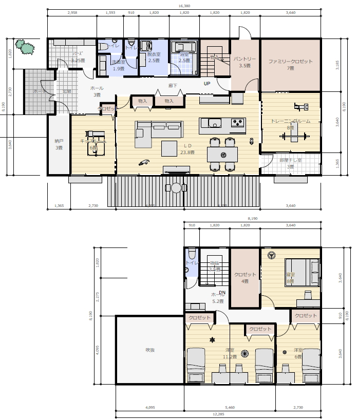 キッチンはキッズルーム、リビング、ダイニング、筋トレルームが全て見れる位置にしたい。