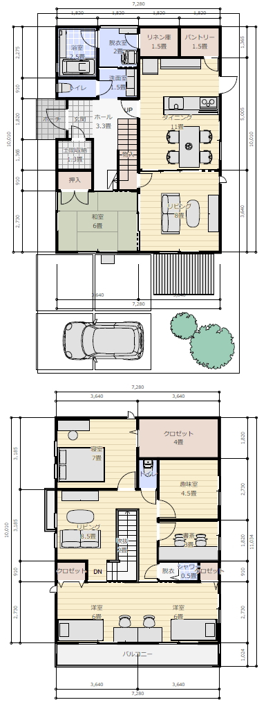 間は間仕切り家具で仕切る(仕切らない場合は大きな一部屋として使う)
