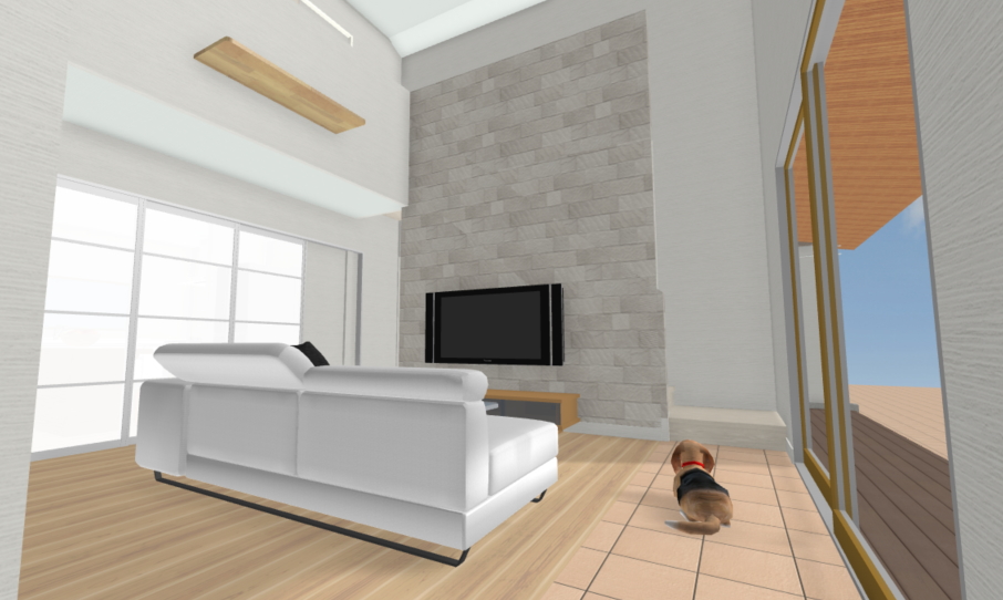 リビングの掃き出し窓の手前50cmくらいはタイル張りとして、犬が冬に日向ぼっこをしたり、夏にお腹を冷やしたりできるスペースに
