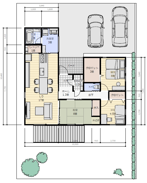 夫婦の寝室が1室5〜6帖で、ウォークインクローゼットも希望。